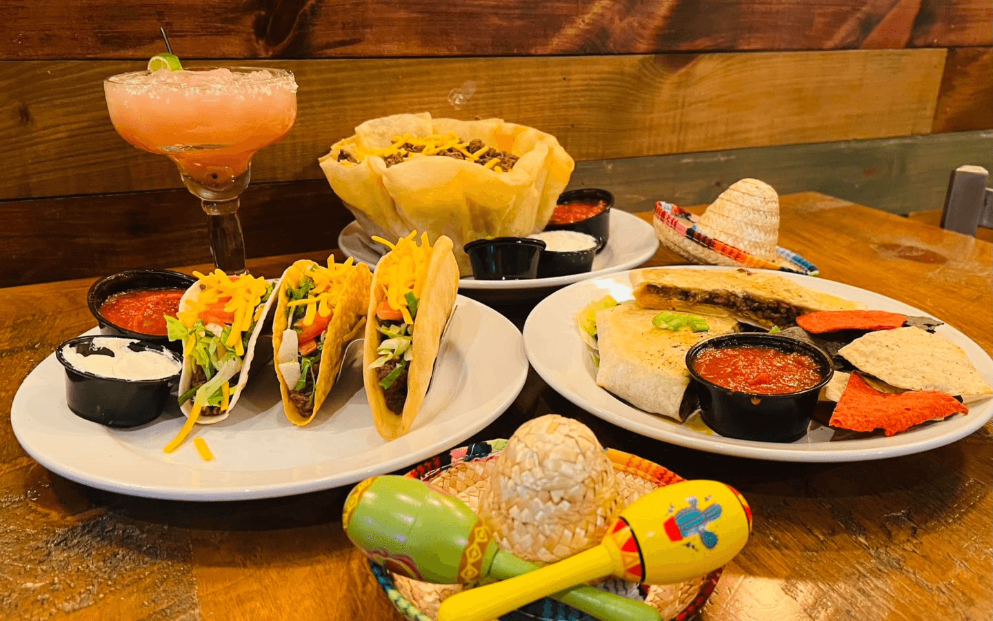 Seasoned ground beef, lettuce, tomato, onion, and cheddar cheese served in a housemade shell, and also served with salsa, sour cream, and guacamole